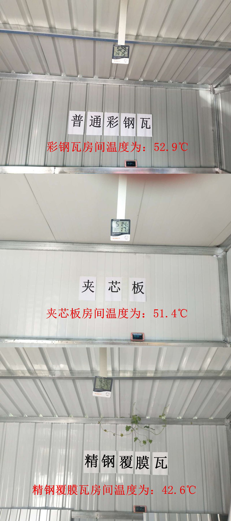 糖心VLGO官网入口从图中可以看到,普通彩钢瓦和夹芯板房间的隔热性能并不好,而糖心LOGO原创视频在线观看覆膜瓦房间温度比夹芯板以及彩钢瓦房间温度要低,小编在拍照过程中进入彩钢瓦和夹芯板房间就感觉闷热难当,糖心LOGO原创视频在线观看覆膜瓦房间就感觉更加凉爽宜人。
